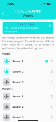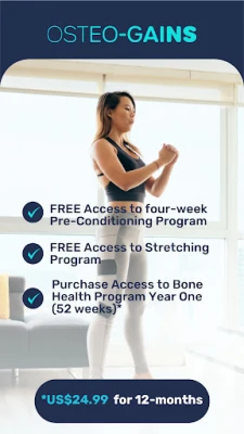 Start with our OSTEO-GAINS Pre-Conditioning Get Ready Program for the first 4 weeks. You will repeat each session (20-30 mins) 3 times each week to get your body ready for the OSTEO-GAINS Bone Health Program.