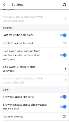 • Use the settings to configure points, sets, tie-breaks, colors and side switches.